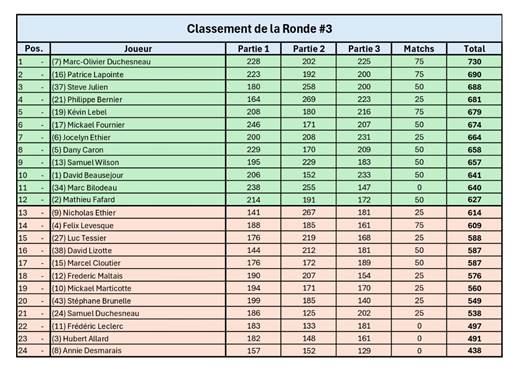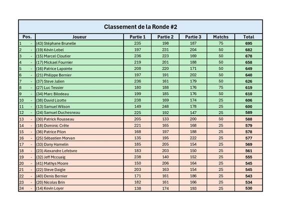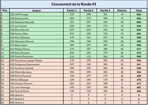 Les 12 joueurs qualifiés à la ronde précédente ont ensuite affronté les positions 13 à 24 du classement général. C’est Stéphane Brunelle qui a terminé 1er de cette ronde avec un beau score de 695 en ayant remporté ses 3 matchs. On peut voir que les quilles sont extrêmement importantes, puisqu’une seule quille supplémentaire a permis au plus jeune Duchesneau d’accéder à la ronde suivante. D’ailleurs, 2 matchs se sont terminés en égalité. À la 1re partie, David Lizotte et Jeff Mccuaig ont joué chacun 238, une excellente partie. Ils ont dû rejouer les carreaux 9 et 10 pour déterminer le gagnant. C’est finalement Jeff Mccuaig qui a remporté les 25 quilles supplémentaires. Le même phénomène s’est produit à la 2e partie et c’est Steve Julien qui a remporté 25 quilles supplémentaires contre Nicolas Brin.