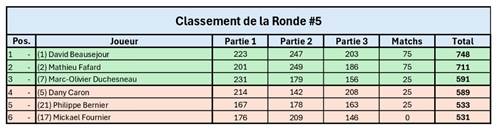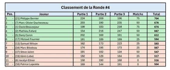 Encore une fois, nous avons assisté à d’incroyables matchs lors de la ronde 4. D’ailleurs, après 3 parties, Mickael Fournier et Samuel Wilson avaient tous les 2 un total de 583. Ils se sont alors affrontés dans un match « suicide» dans lequel Mickael Fournier en est ressorti le grand gagnant. Les joueurs éliminés lors de cette ronde sont repartis avec une bourse allant de 350 $ jusqu’à 400 $ chacun.
